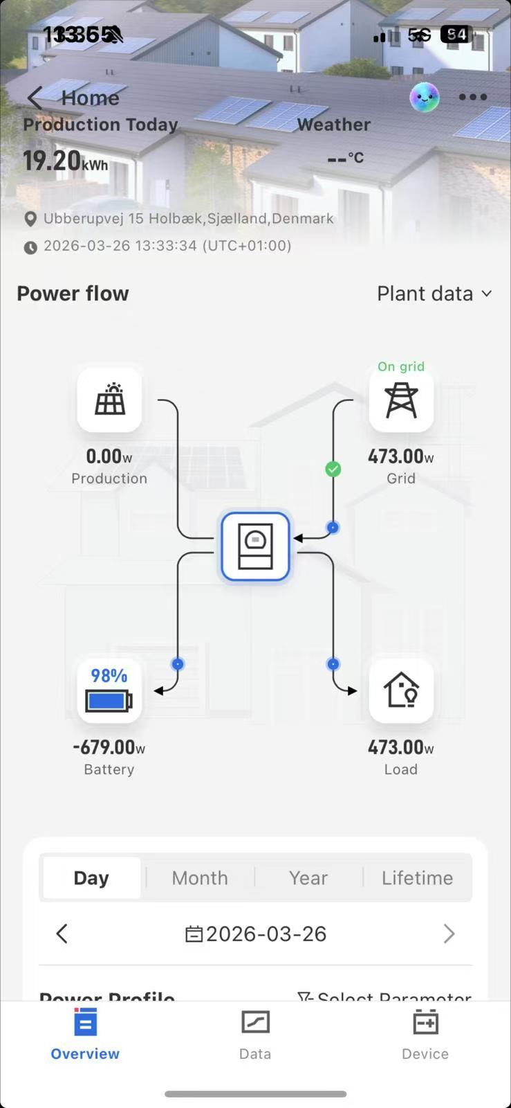 A fotovoltaikus termelési teljesítmény közvetlenül 0 W-ra csökken. A rendszer leállítja a PV-termelést, és teljes mértékben rá támaszkodik