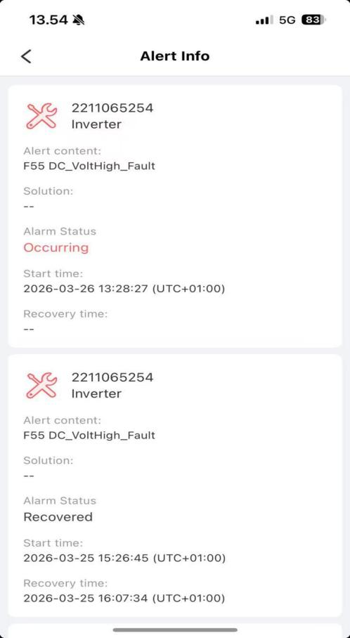 A platform F55 DC-t jelent - Volt Magas - Hibajelzés: DC busz vége feszültség. A hibák nappali csúcsidőben fordulnak elő - besugárzási periódusok, és automatikusan törlődnek, ha a besugárzás csökken. Az ismételt minta megfelel a tipikus egyenáramú túlfeszültség időzítésének.