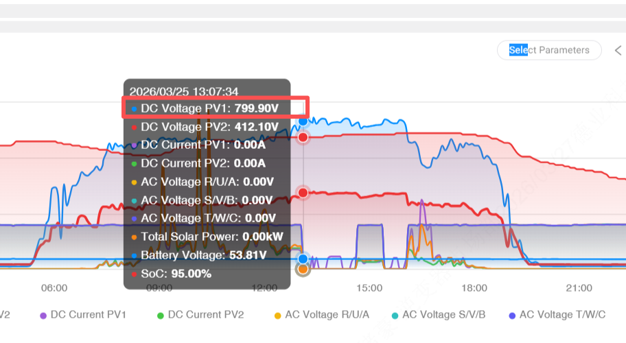 - Közvetlen kioldás: Délben erős besugárzás mellett a PV feszültség tovább emelkedik, és átlépi a védelmi küszöböt.