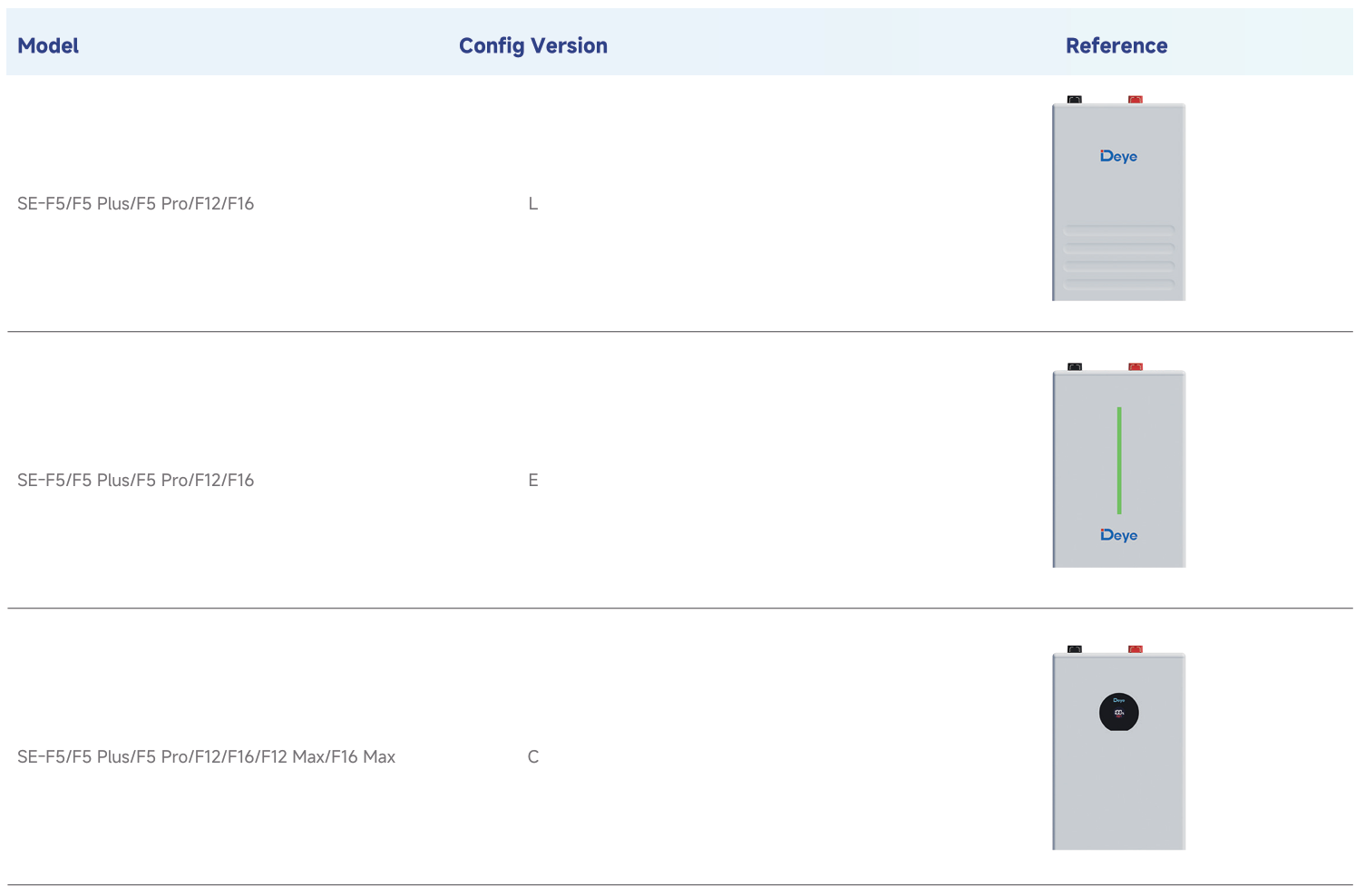A Deye három konfigurációs verziót sorol fel, amelyek elsősorban az előlap megjelenését és a felhasználói jelzéseket változtatják meg: