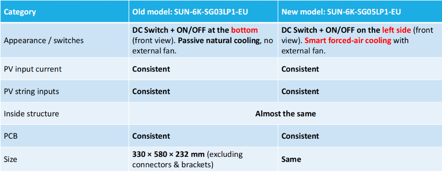 A régi modellről (SUN-6K-SG03LP1-EU) az új modellre (SUN-6K-SG05LP1-EU) való áttérés a hűtés és a felhasználói felület kialakításának javulását tükrözi, a kényszerlevegős hűtéssel és egy könnyebben hozzáférhető kapcsolóelrendezéssel. Ezek a változtatások javítják az inverter teljesítményét és egyszerűbb használatát. A telepítőknek azonban figyelembe kell venniük az új külső ventilátor lehetséges zajhatásait, és megfelelő távolságot kell biztosítaniuk a hatékony légáramlás érdekében. Az alapvető elektromos alkatrészek és méretek nagyrészt változatlanok maradnak, biztosítva a folyamatosságot és a kompatibilitást a telepítésekben.